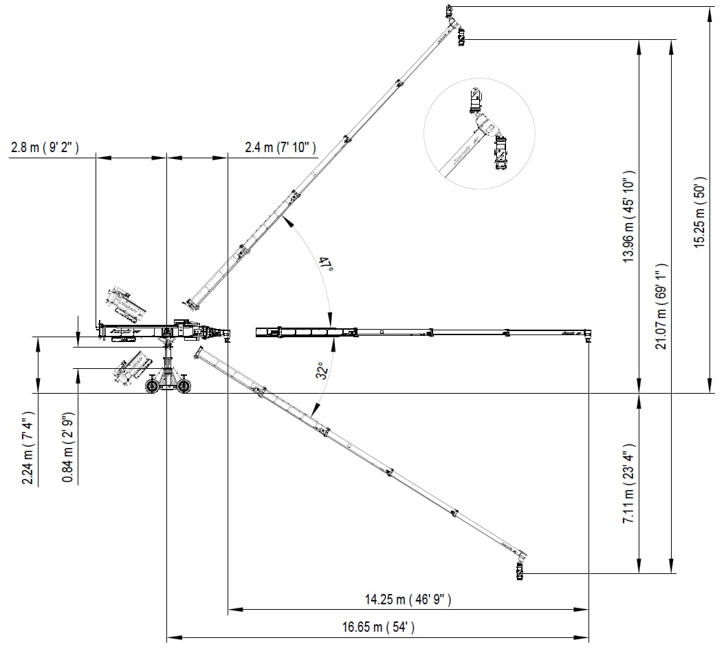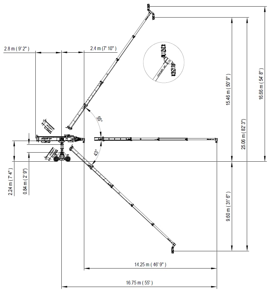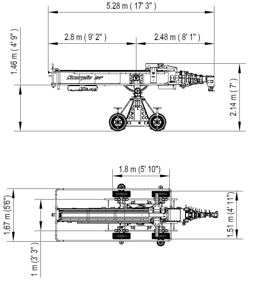 El Scorpio 55′ está basado en el fiable Scorpio 45′ que comparte los mismos componentes del esqueleto, solo añadiendo una sección telescópica más para aumentar la altura del objetivo en 3m (9’7’’).